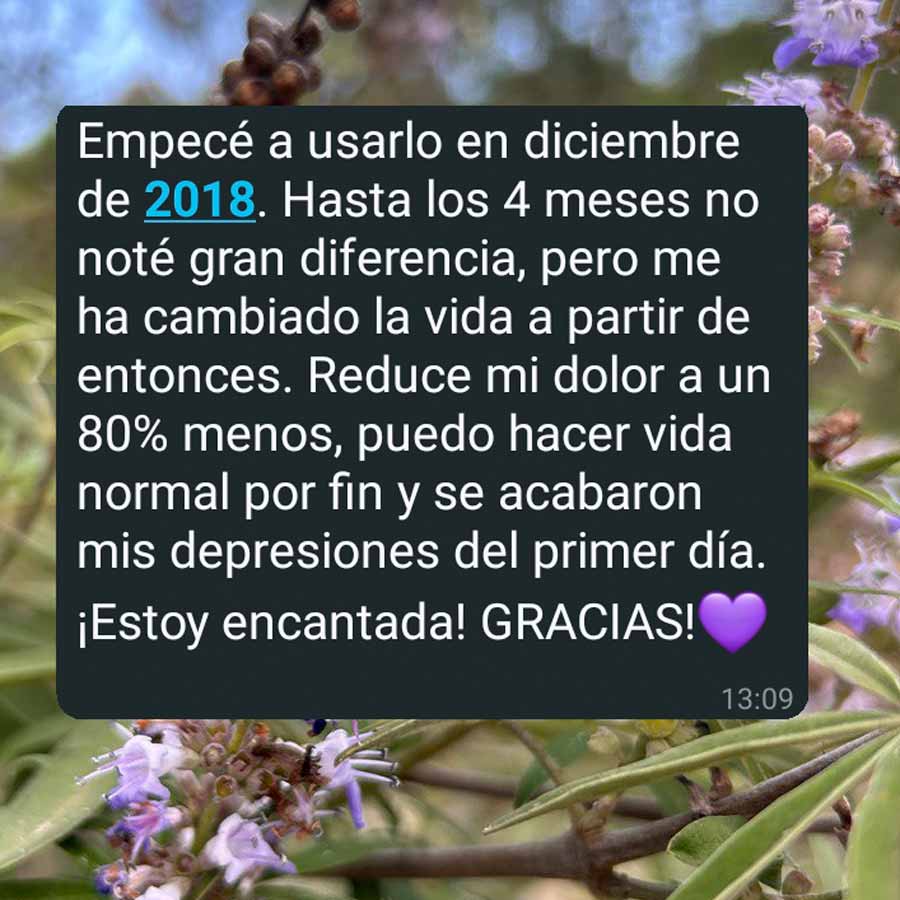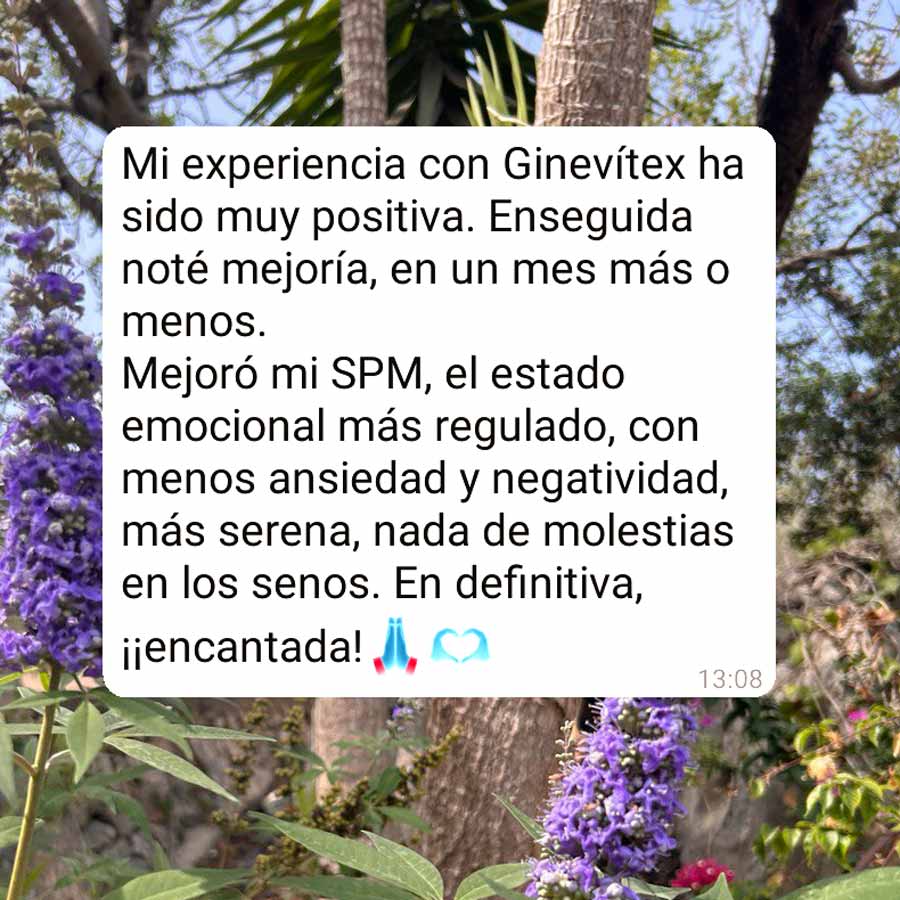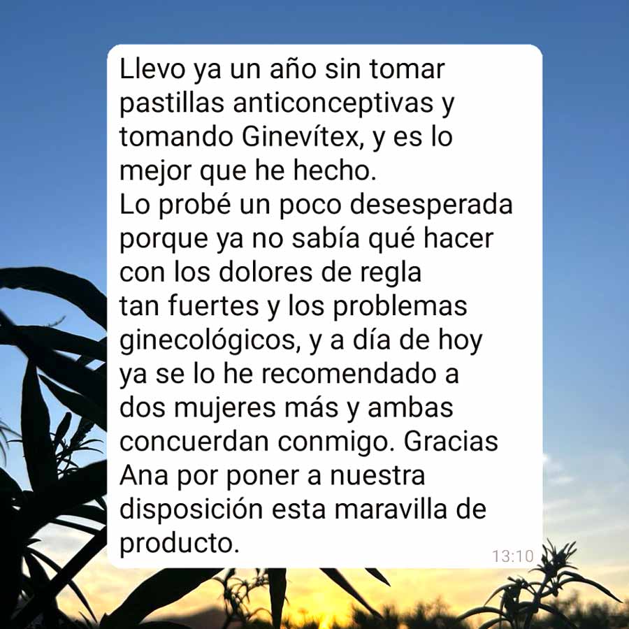 Así, he estado hasta los 32 años que tengo, que se dice pronto… pero te acabas acostumbrando. Siempre supe que daría con algo que me quitase el dolor porque no era normal. Hace cinco meses, hablando de este tema con una amiga, me recomendó Ginevitex. Nunca había oído hablar de esta planta tan maravillosa y que tantos beneficios tiene en la mujer. Comencé en septiembre de y el primer mes noté alivio, menos dolor en los senos y nada de ansiedad. Esto me ánimo a seguir, ya que, al ser una planta, sé que debía ser constante. Después de 4 meses, es increíble que… ¡Por fin! Síííí, muy emocionada, te puedo decir, que hago vida normal. Vivo mi menstruación hasta con alegría porque me siento estupenda en esos días. Ya no noto esa presión en mi útero y he dejado hace dos meses de tomar ningún tipo de analgésico.