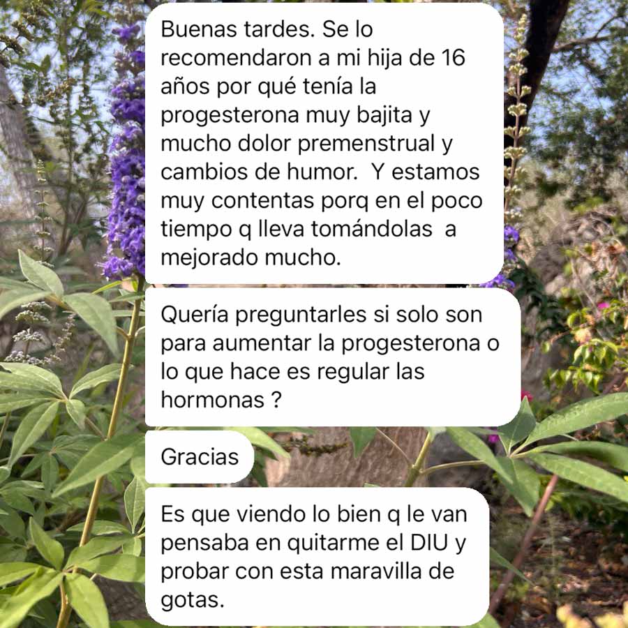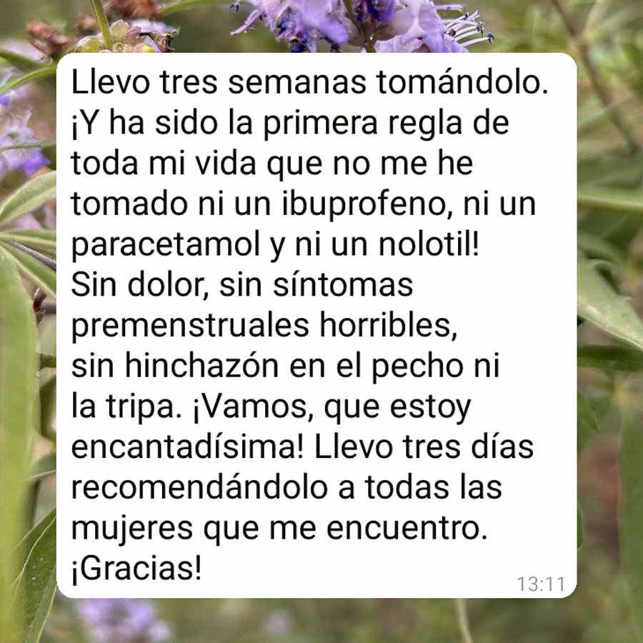 Sufría dolores horribles de menstruación. Después de dos meses de tomar esta maravillosa planta puedo decir que ¡Por fin encontré algo que me hace sentirme libre y sin dolor! Incluso puedo caminar y salir. Antes me tiraba 1 ó 2 días en cama, sin apenas poder caminar. Estoy muy agradecida por cruzarme en mi camino con estas gotas y con Ana. Enseguida me aconsejó y me dio consejos de cómo sentirme mejor. Necesitaba contaros lo maravillosas que son.