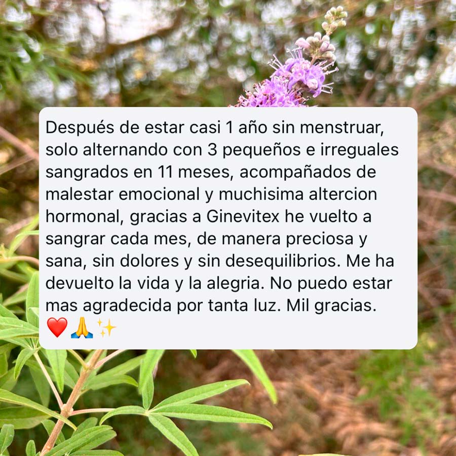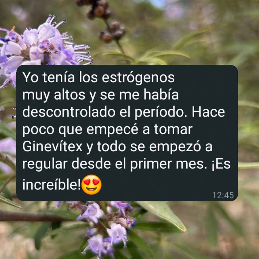 Desde que empecé a tomar Ginevitex el ciclo menstrual parece ser más regular y menos doloroso. Aunque el resto de aspectos tengo que seguir trabajándolos, el cambio más importante que noté fue el impulso de mi feminidad, de quererme como mujer y de empezar a tomar consciencia de mi cuerpo en cada una de las diferentes etapas que nos acompañan mes a mes.